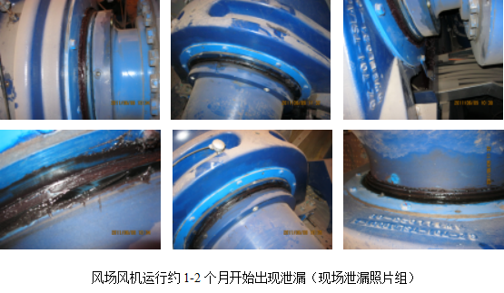 泄漏量大,且風(fēng)場(chǎng)風(fēng)機運行約1-2個(gè)月就開(kāi)始出現泄漏(見(jiàn)下圖2),須經(jīng)常派人爬上風(fēng)機塔頂加注潤滑油,給設備維護造成了較大的困難。