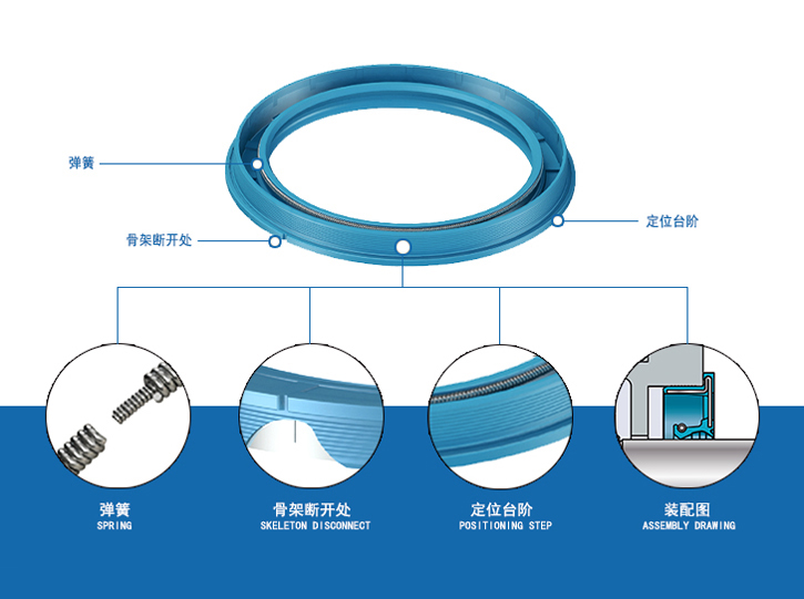 1.在傳統骨架油封基礎上,增加了背部外圓周定位臺階設計,且內置骨架為剖分式T型結構。