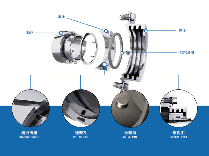 1.位于動(dòng)環(huán)上的壓縮彈簧設計,保證了旋轉軸非工作狀態(tài)、失去離心力的情況下,驅動(dòng)推環(huán)帶動(dòng)滑環(huán)壓緊密封圈,從而實(shí)現停機密封。